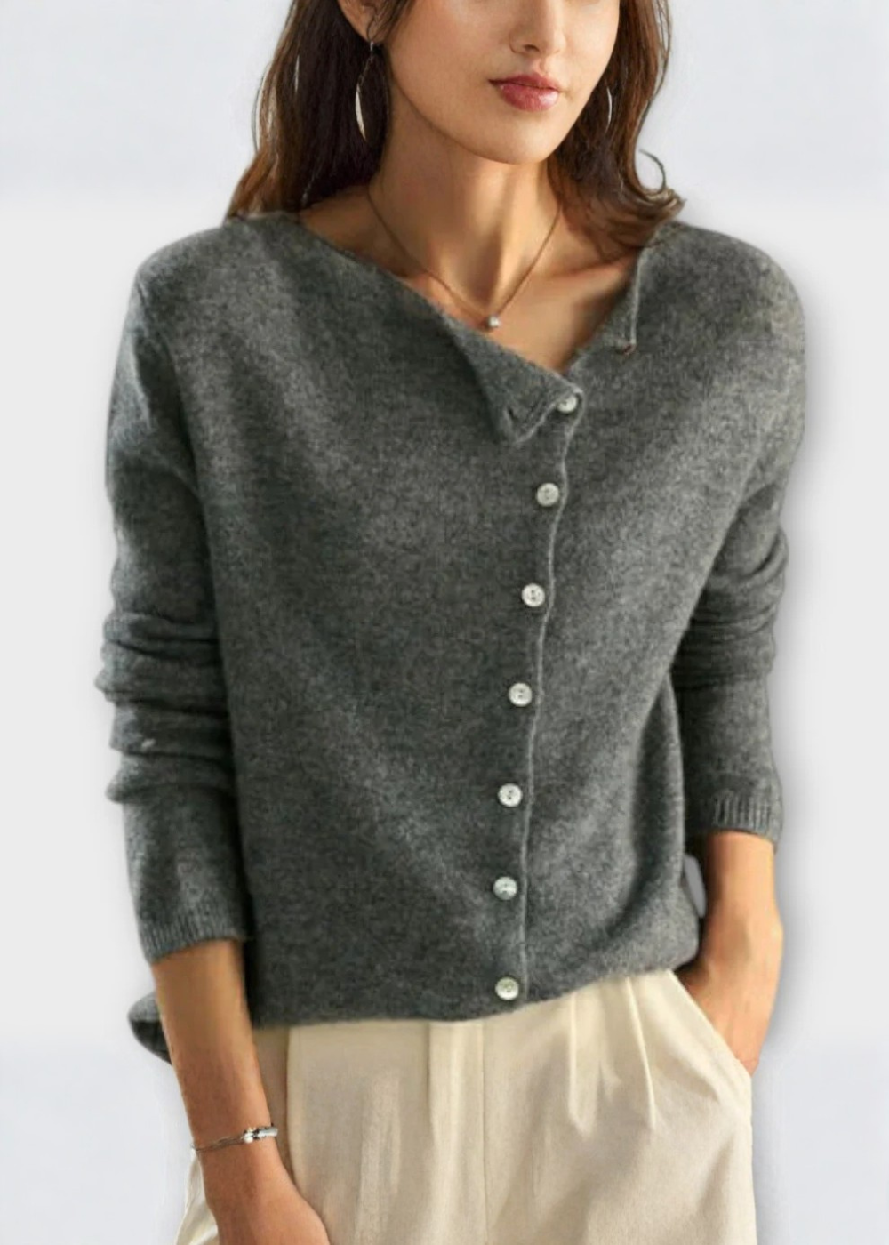 • Asymetryczny design: Asymetryczne zapięcie na guziki nadaje temu klasycznemu kardiganowi nowoczesny akcent.