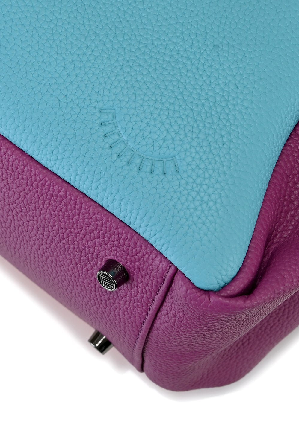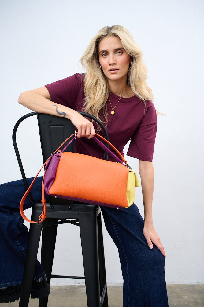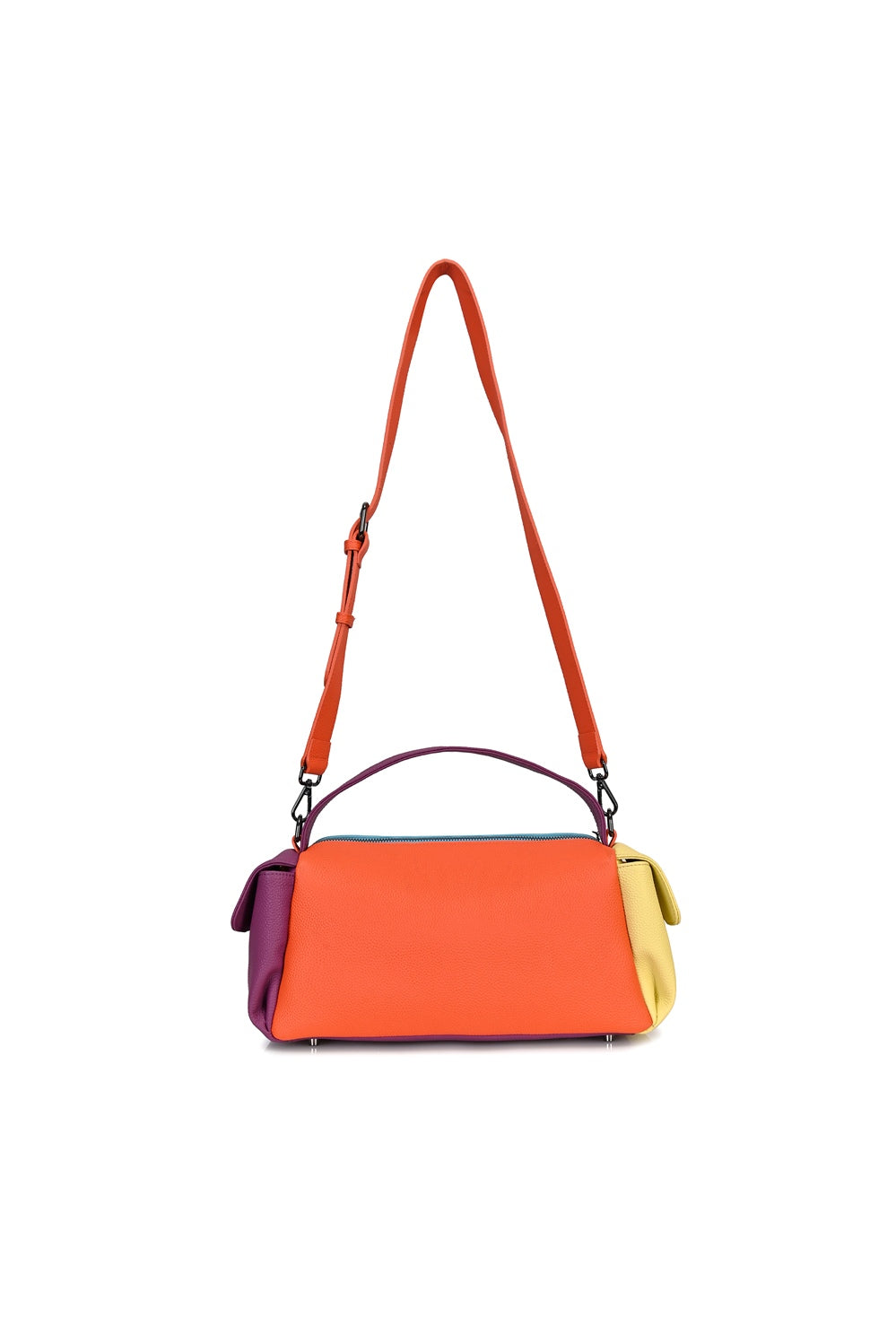Torebka Dopamine Joy to prawdziwa bomba energetyczna i odważny manifest stylu. Główny panel w kolorze turkusowym łączy się z pomarańczowym tyłem i paskiem, fioletowymi uchwytami i żółtą kieszenią boczną.